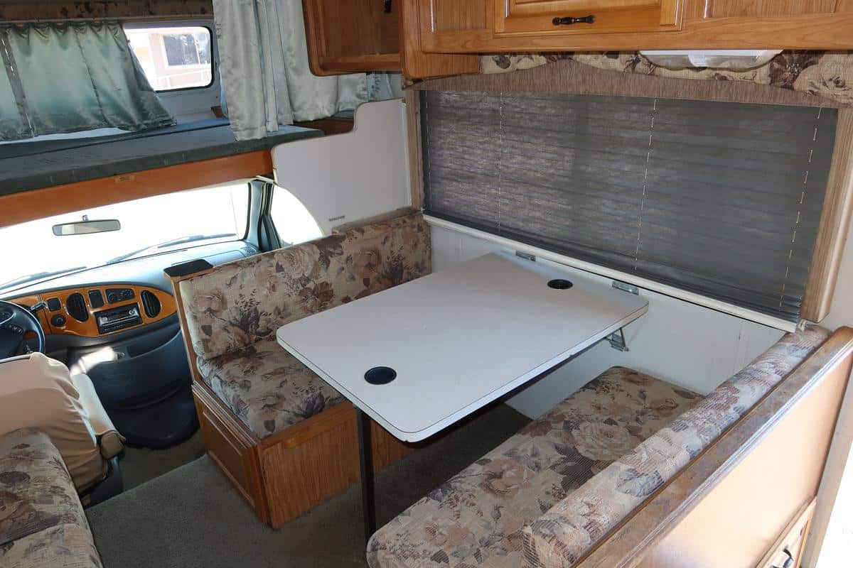- Interior: Functional layout with dinette, lounge seating, and ample storage
