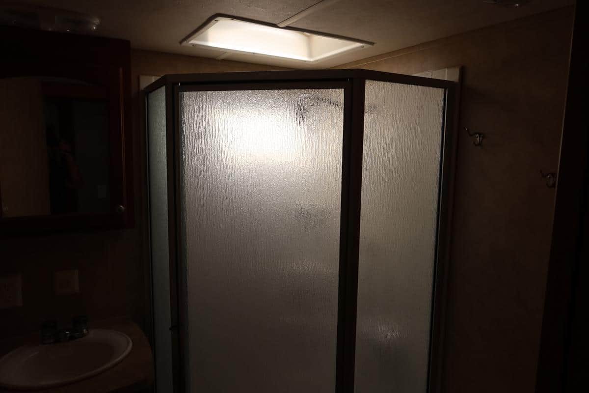 - Large bathroom with corner shower and skylight