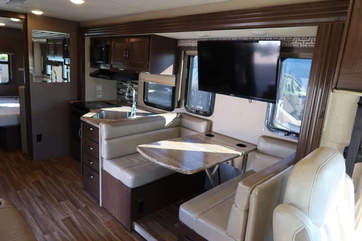 This impeccably clean motorhome has been lovingly maintained, offering a like-new interior that feels both fresh and inviting. Step inside to discover a welcoming space that offers sleeping accommodations for up to 6 people, including a drop-down bunk over the cab, a convertible dinette, and a walk-around queen bed. The large slideout creates generous interior space, while features like a fully equipped kitchen, bathroom with a glass-door shower, and multiple HDTVs ensure you re traveling in style.
