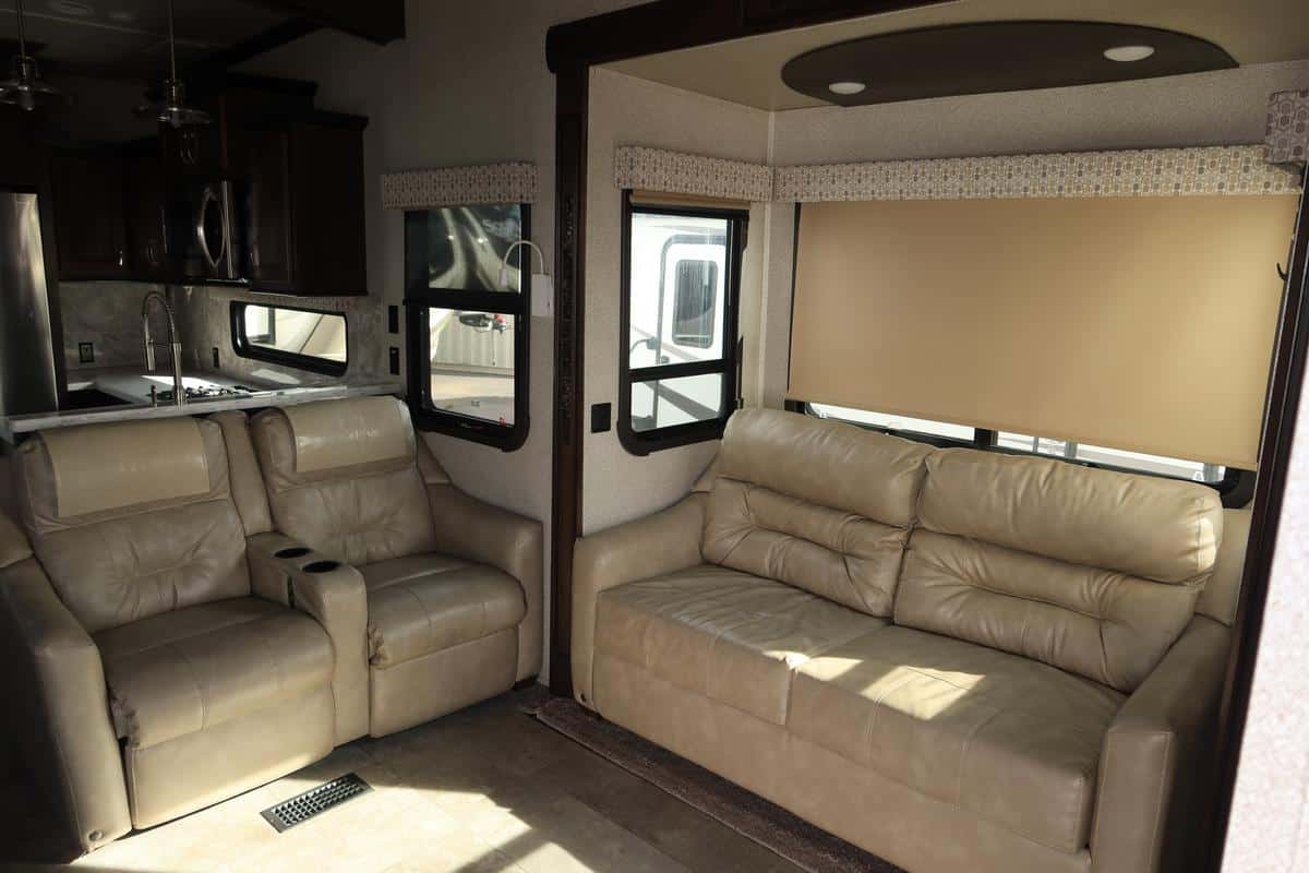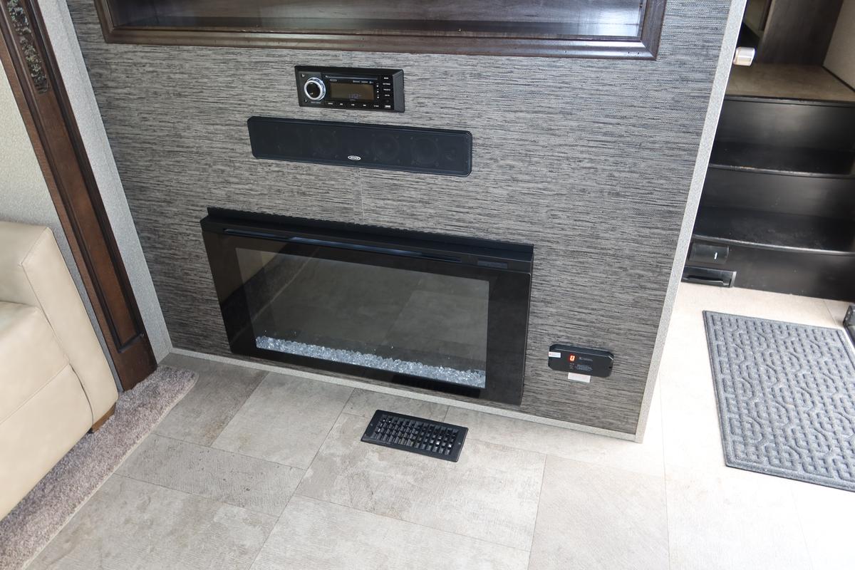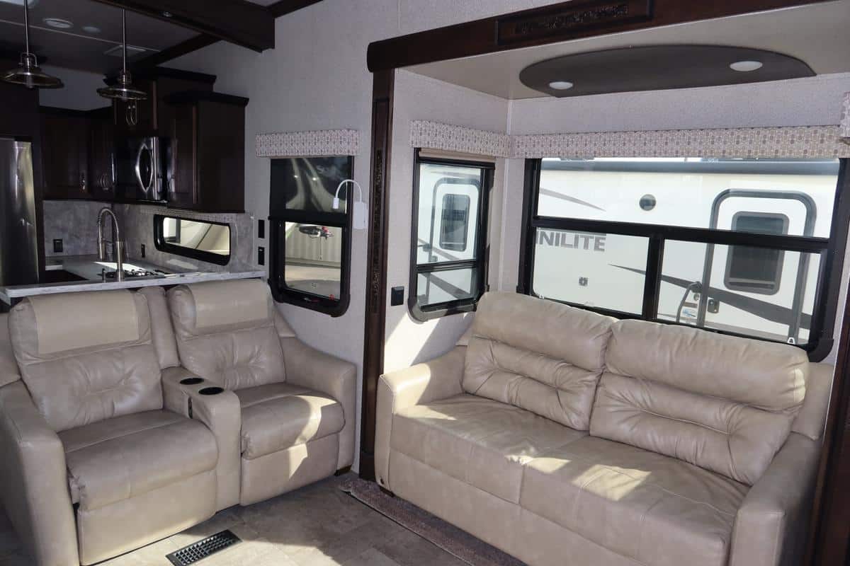- Spacious living area with hide-a-bed sofa, power theater seats, and entertainment center