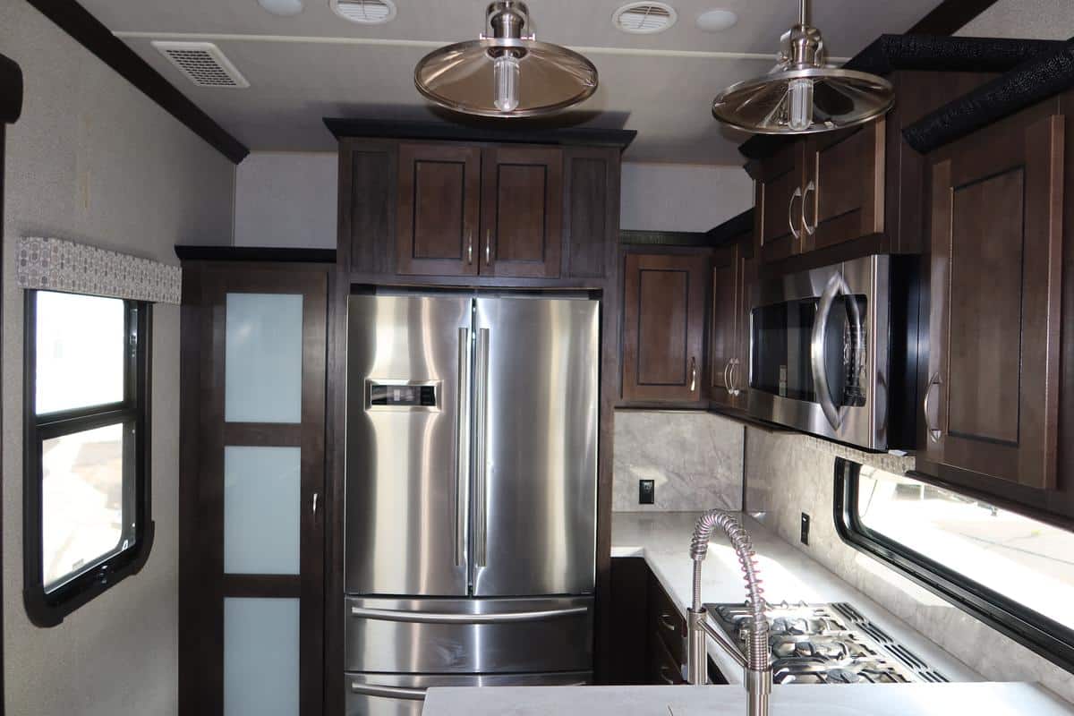 - Rear kitchen layout with ample counter space, pantry storage, and residential-style refrigerator