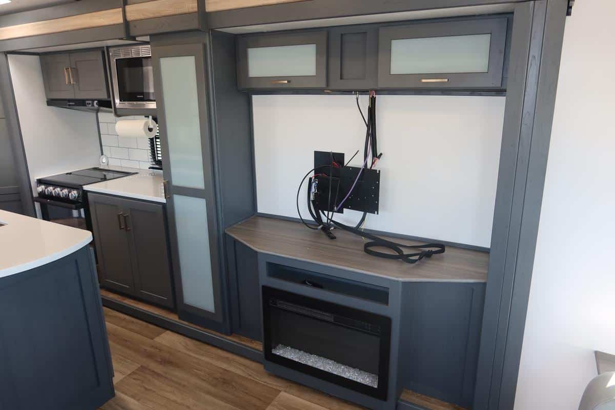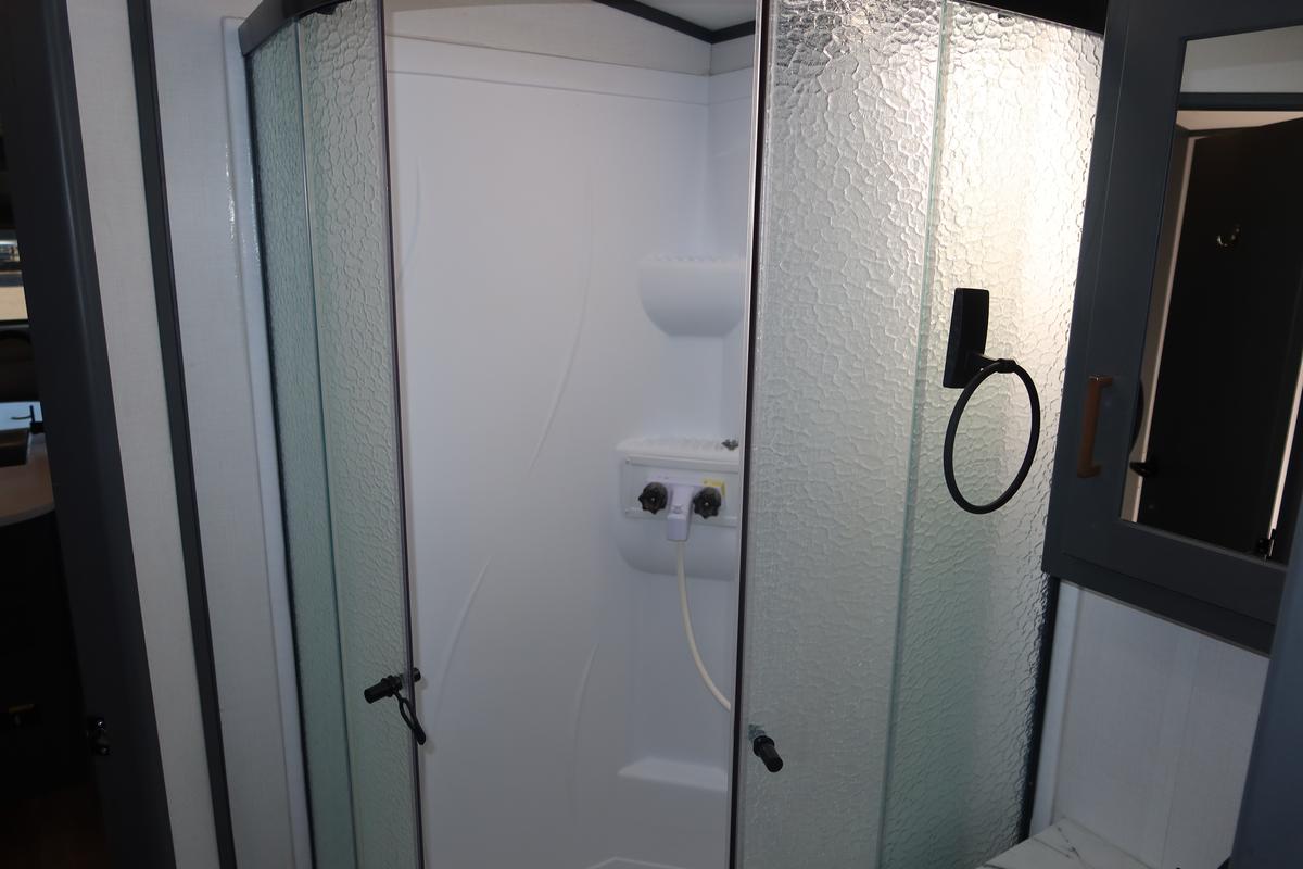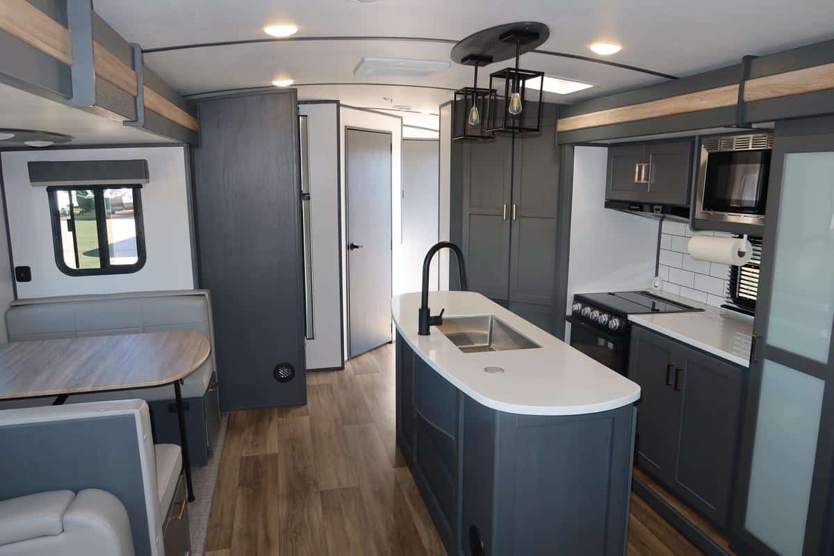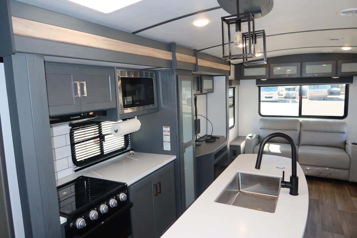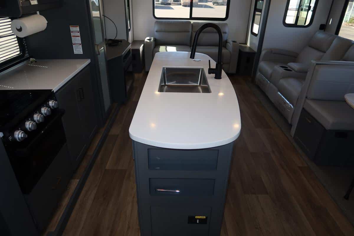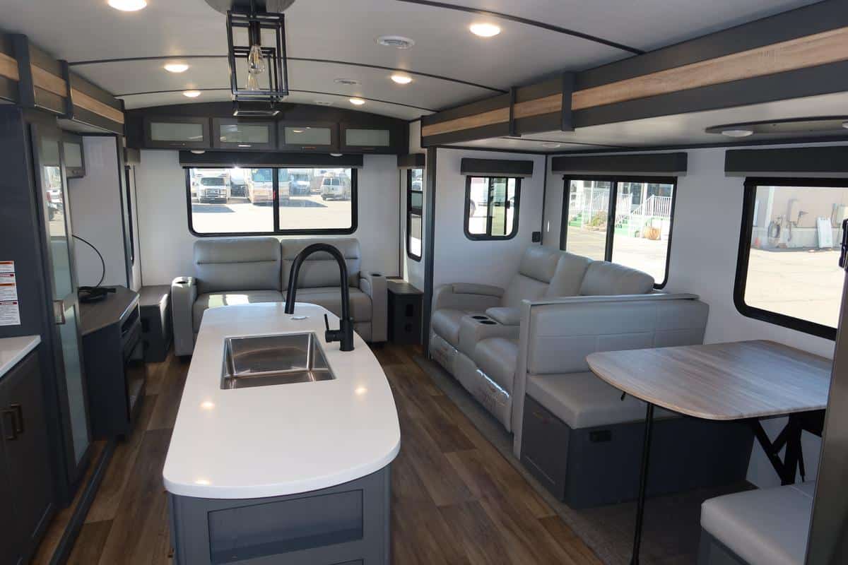 Step inside and youre welcomed by a bright, open living area with opposing slide-outs that create an inviting entertainment and relaxation space. The rear living layout offers comfortable seating and an ideal setup for hosting friends or enjoying quiet evenings. The fully equipped kitchen features ample counter space and storage, making meal prep effortless whether youre at the campground or off the beaten path.